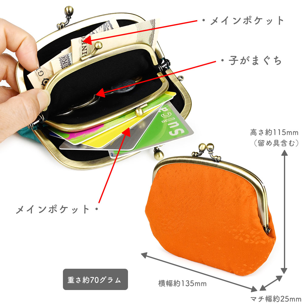 [アイテムについて] 和雑貨として人気の高い「がまぐち財布」の中でも、特に根強い人気を誇る4.1寸親子がま口財布です。 手のひらサイズで程よい大きさの親がま口の中には、小さな子がま口を内蔵。 親子構造により、親がま口内部が2つに分かれ、合計3層で仕分けできる便利な仕様になっています。 お札・カード・小銭を分けて収納できるので、お財布としてはもちろん、小物入れとしても活躍。 生地の間には芯地を挟み込み、型崩れしにくく美しいフォルムを長く保ちます。