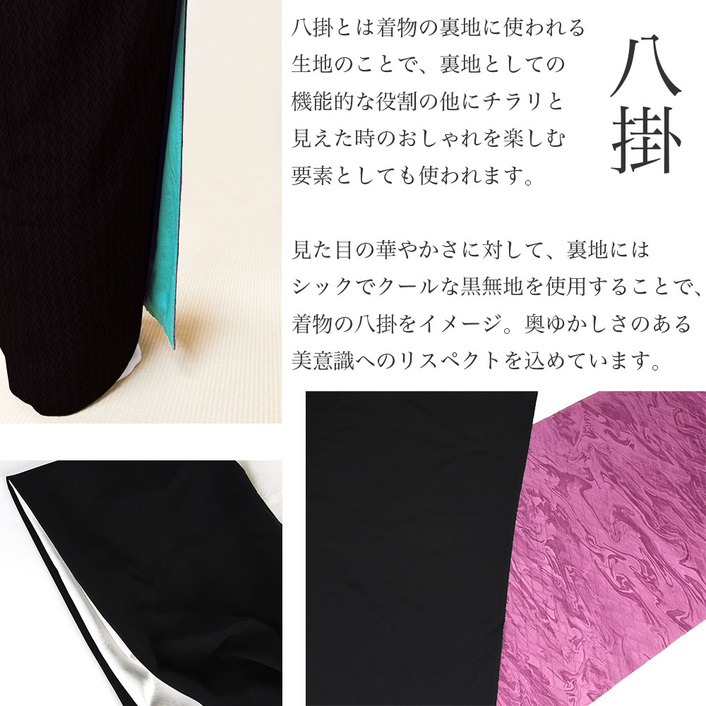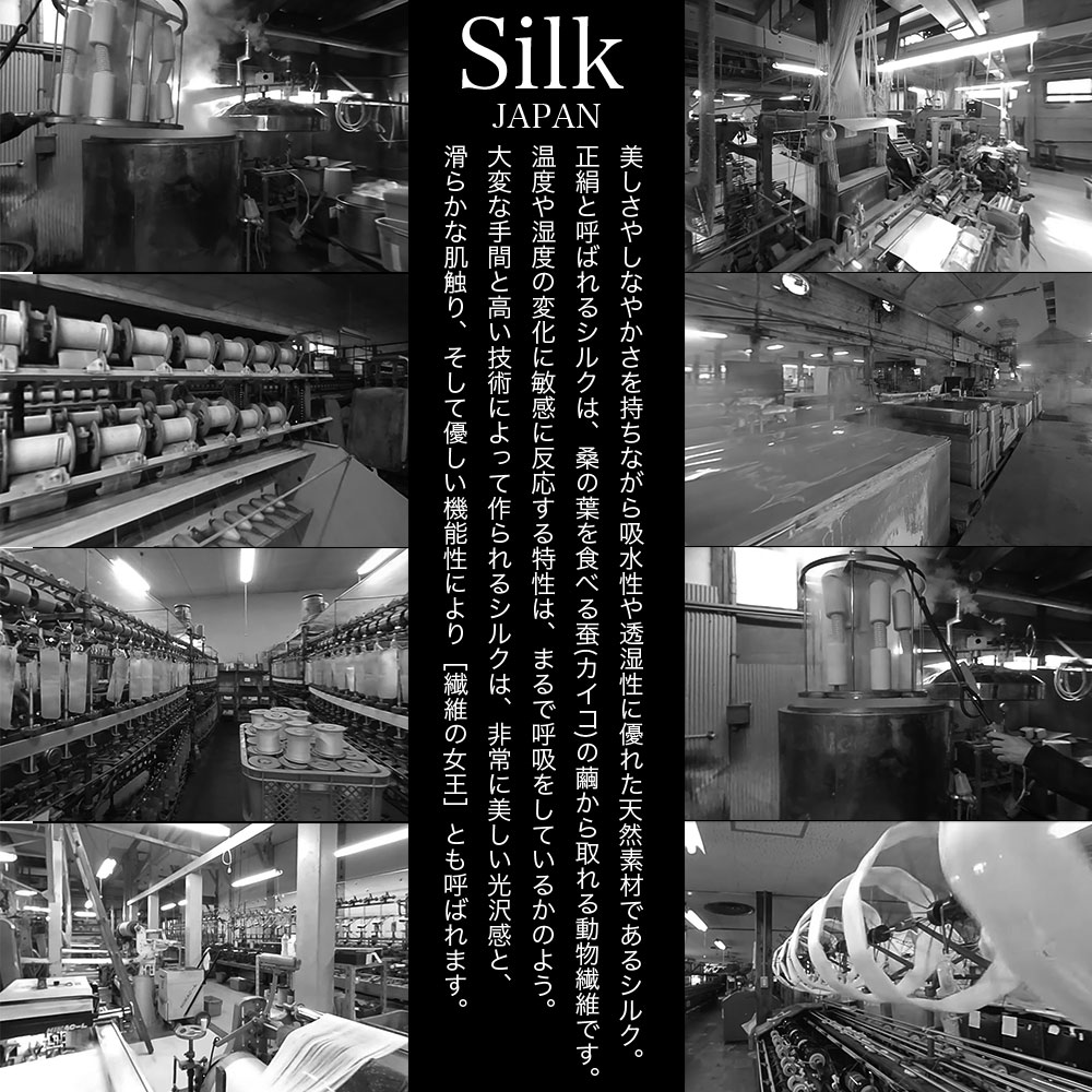 [素材について] 美しさやしなやかさを持ちながら吸水性や透湿性に優れた天然素材「シルク」。 正絹は、桑の葉を食べる蚕(カイコ)の繭から取れる動物繊維で、温度や湿度の変化に敏感に反応し、まるで呼吸するような特性を持ちます。 手間と高い技術によって作られるシルクは、美しい光沢、滑らかな肌触り、そして優しい機能性により「繊維の女王」と呼ばれています。